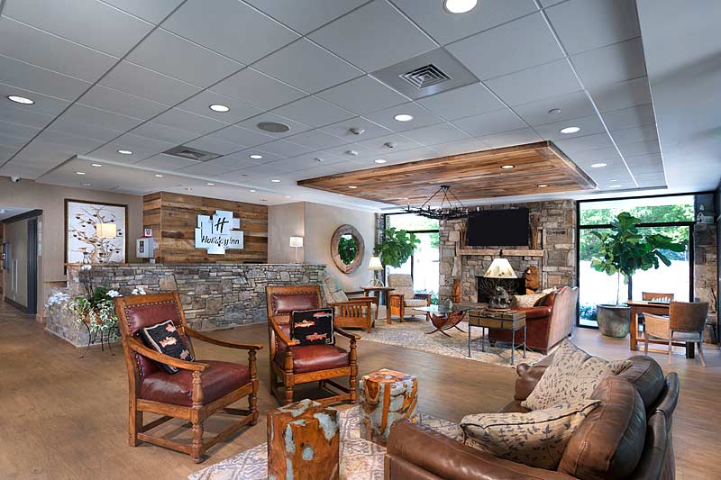 Holiday Inn Biltmore East, a 65,000 square foot, full-service property with 111 rooms, was completely renovated over a twenty-four month period. The multi-phased project included an all new timber framed porte-cochère, parking lot, waterfall, landscape lighting, lobby, restaurant and bar, convention space, fitness center, outdoor pool, common spaces, and guest rooms. John Fisher (Fisher Architects) and local interior designer Lizzy Summerlin (LS Interior Design) worked to incorporate the newest Holiday Inn H4 Design standards while maintaining the custom, unique, and mountain concept guests have always favored about this property. Local artwork, furniture, and design makes this hotel a standout from the rest. The hotel was renovated while occupied with only a sixty day total closure period.